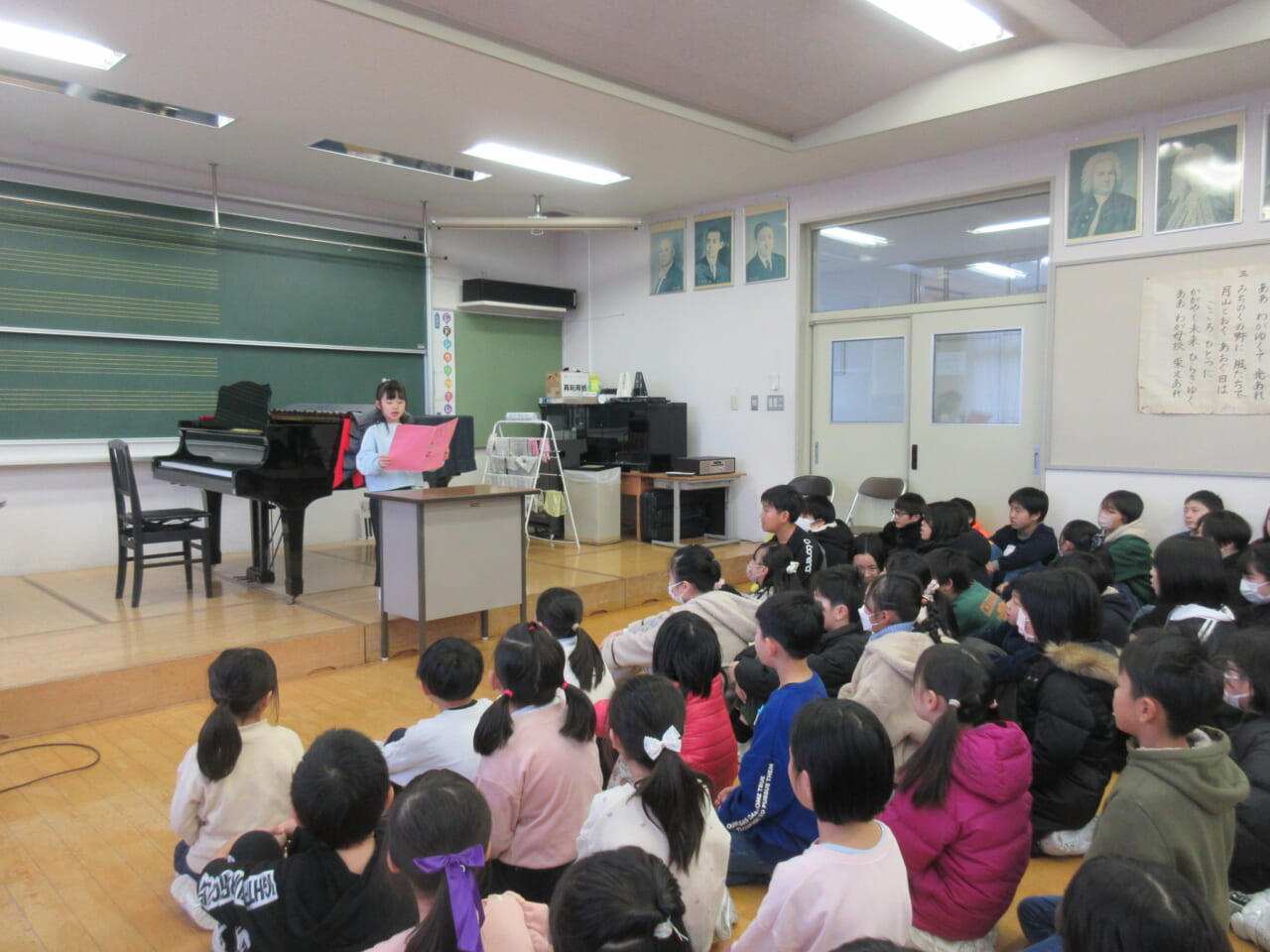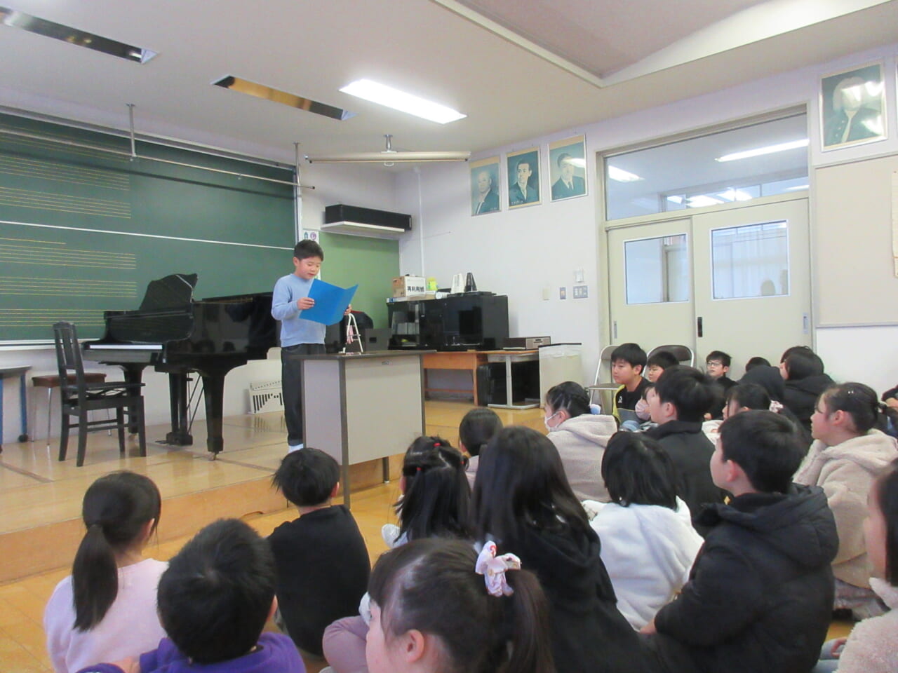 12月22日(月)、5年生が全校児童と学習でお世話になった皆さんや先生方にお米のプレゼントをしました。お米の名前は「う米!」。みなさん、おいしくいただいてください。