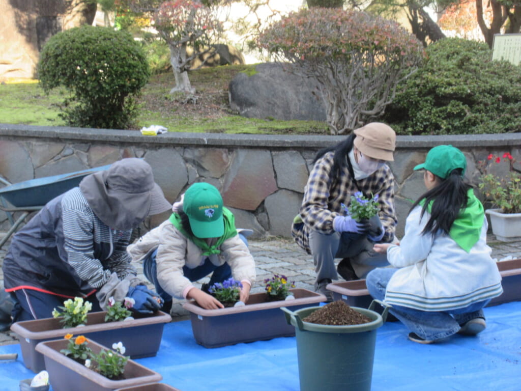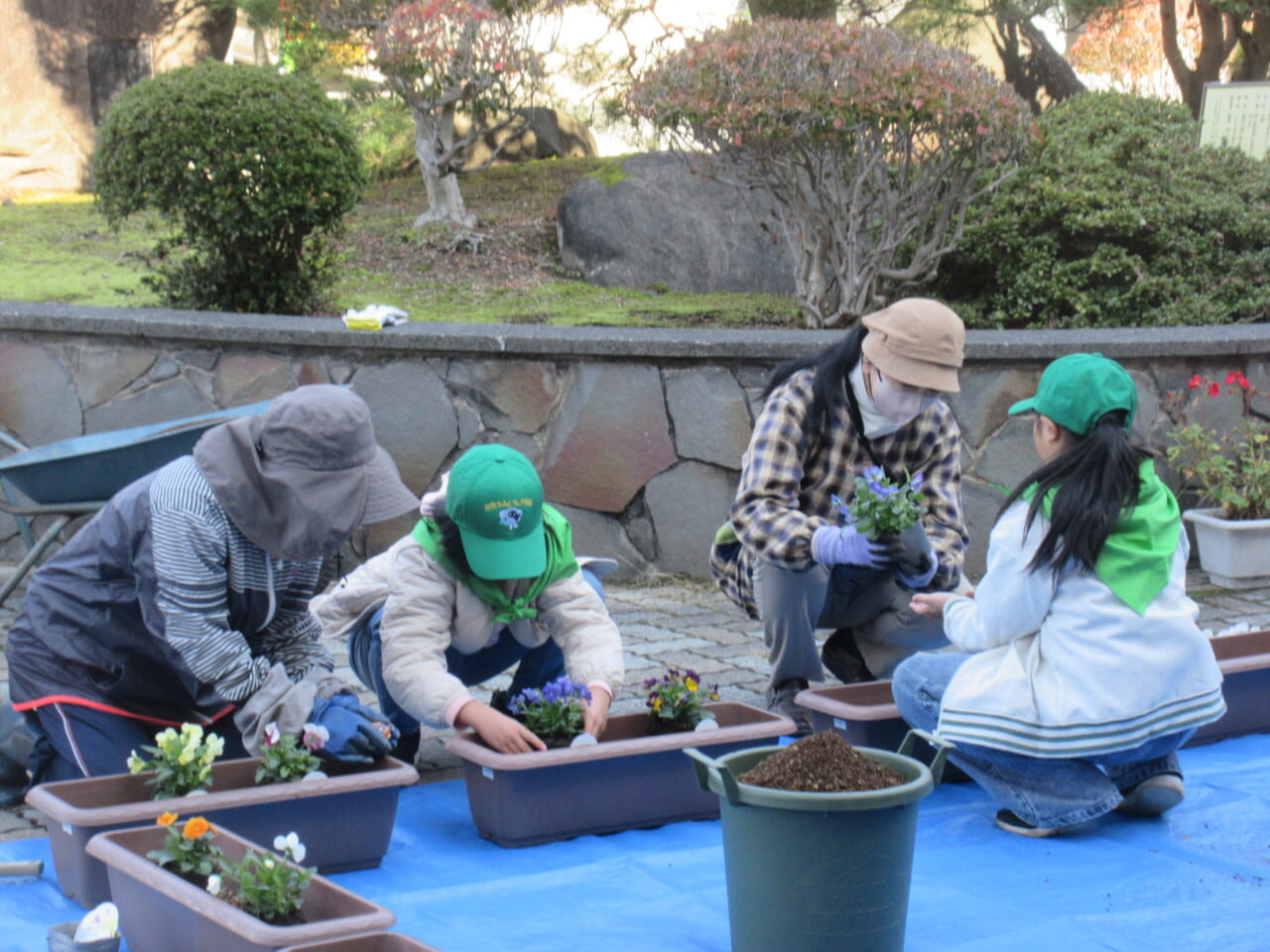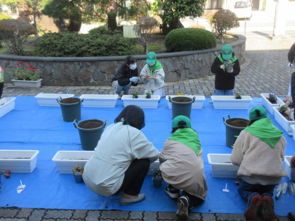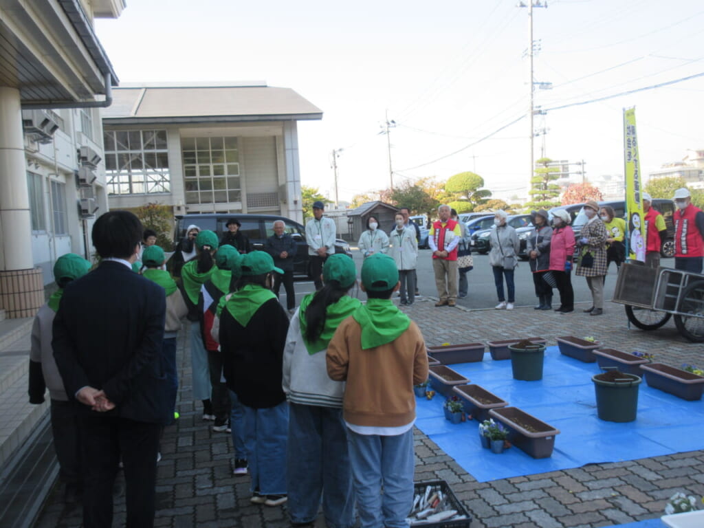4年生人権の花植え、社会を明るくする運動花植え 10月30日(木)、4年生が緑の少年団活動の一環として花の植栽を行いました。市の人権擁護員の皆様、保護司会天童分会の皆様のご協力のもと、植栽の意義等についてのお話を伺った後、さっそく花の苗をプランターに植えました。どんな花が咲くか楽しみです。