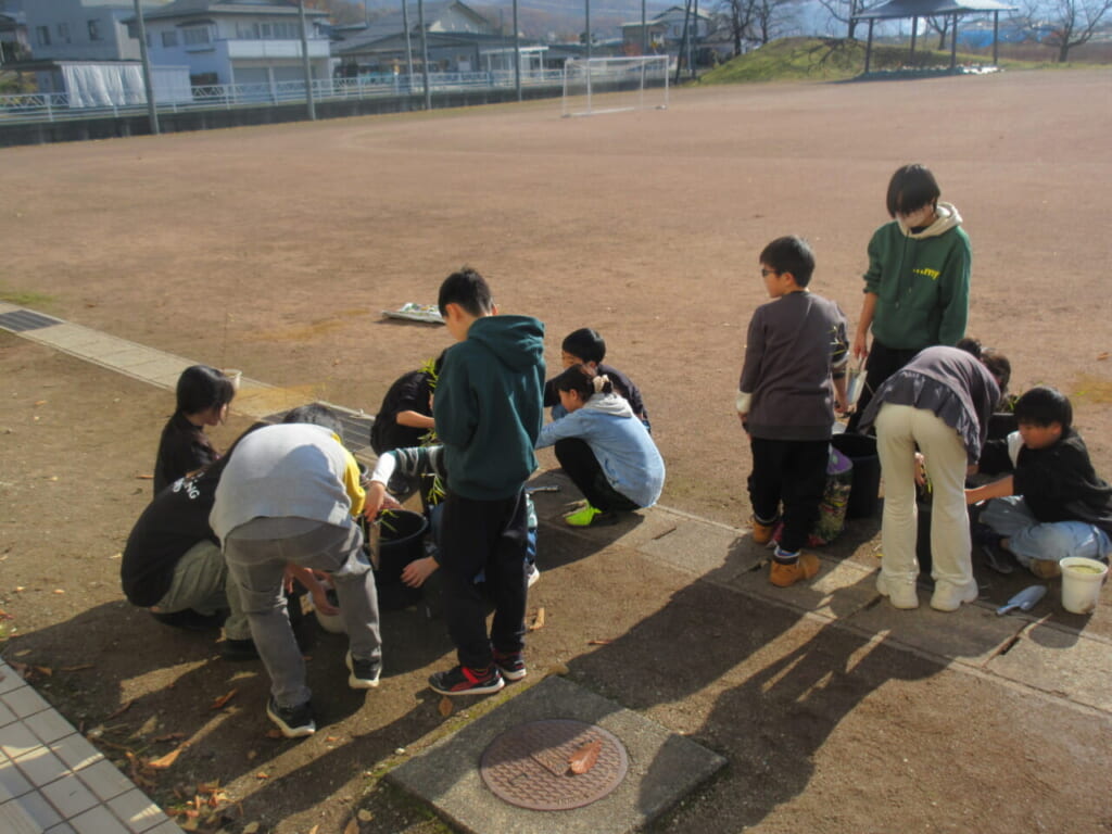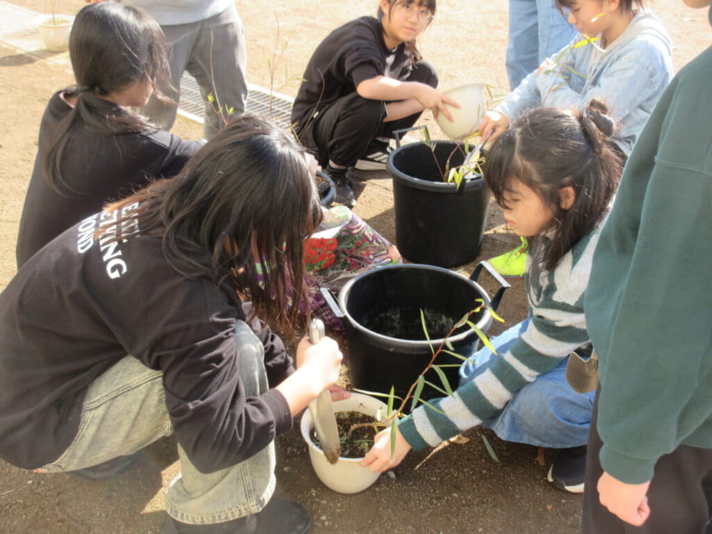 ヤナギの苗木の植え替え 11月27日(木)、6年生が、大きくなったヤナギの苗木の植え替えを行いました。7月に苗木を土に植え替えてから約4か月。順調に育った苗木を大きな鉢に植え替えました。固まった苗木の根を丁寧にほぐしたり、植え替えて重くなった鉢を運んだりと、心を込めて作業に取り組みました。これから益々大きく成長することでしょう。