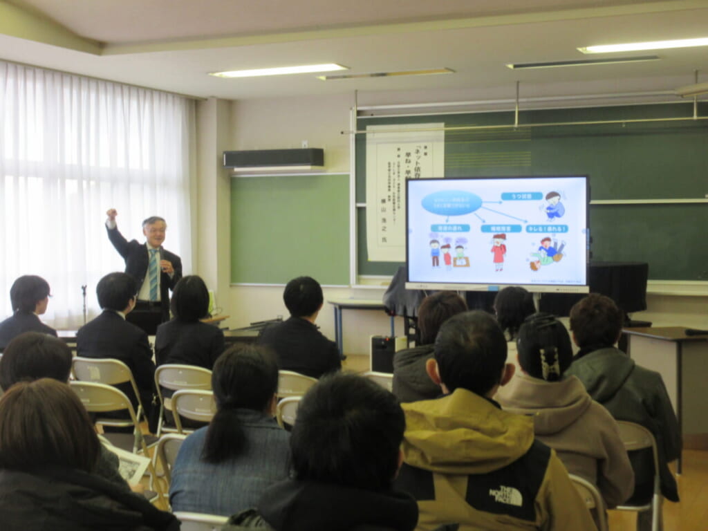 授業参観、PTA研修会 2月6日(金)、授業参観とPTA研修会を行いました。授業参観は、総合や生活科の発表、道徳、特別活動等の授業でした。PTA研修会は、天童市の子どもたちに関わっておられる先生をお招きして「ネット依存による子供への影響と早ね・早起き・朝ごはんのすすめ」という演題でお話をお聞きしました。メディア時間の調整ではなく、ネットに目を向けさせない、別の体験活動や親子で同じ活動をすることに目を向けさせることが大切である、というお話をしていただきました。とても有意義な時間でした。