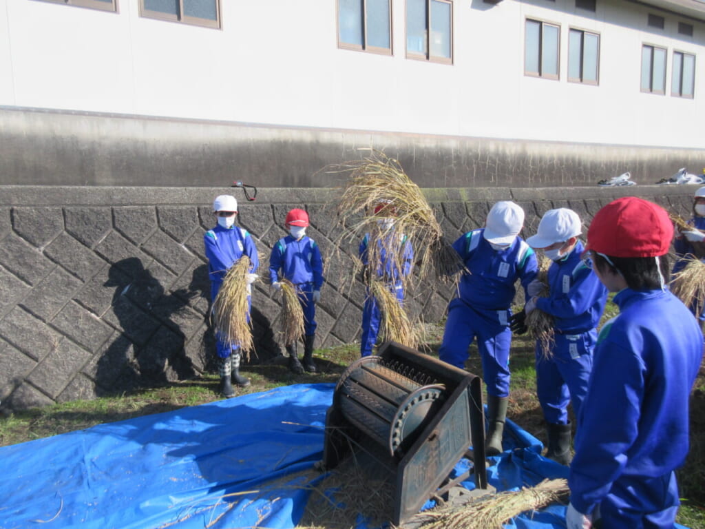 5年生、稲の脱穀作業体験 10月23日(水)、5年生が先週刈りとした稲の脱穀作業体験を行いました。足踏み脱穀機や千歯こきによる脱穀を体験し、その後コンバインによる脱穀の様子を見学しました。脱穀の歴史に体感した時間となりました。