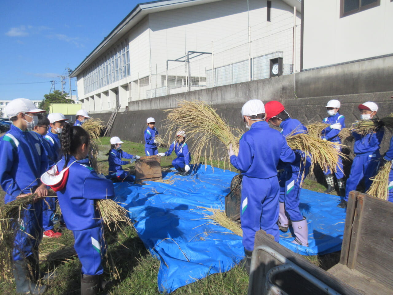 10月23日(水)、5年生が先週刈りとした稲の脱穀作業体験を行いました。足踏み脱穀機や千歯こきによる脱穀を体験し、その後コンバインによる脱穀の様子を見学しました。脱穀の歴史に体感した時間となりました。